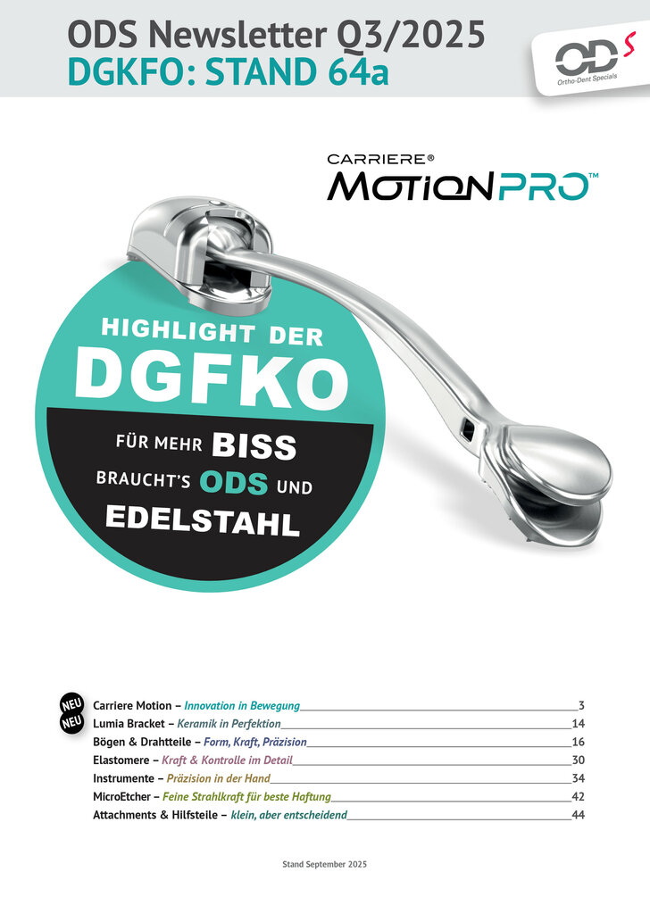 30 Elastomere Kraft & Kontrolle im Detail ODS Chain Die ODS Chain setzt Maßstäbe in Qualität und Performance. Sie gewährleistet eine gleichmäßige, konstante Kraftabgabe über mehrere Wochen und überzeugt durch ihre außergewöhnliche Elastizität mit kontrolliertem Kraftabbau. So lassen sich Terminintervalle verlängern und Behandlungszeit effizient einsparen. Die Ketten sind selbstverständlich latexfrei und verfärbungs- resistent – für zuverlässige Ergebnisse und höchsten Patientenkomfort. Die ODS Chain ist in verschiedenen Ausführungen erhältlich und bleibt durch ihre hohe Farbbeständigkeit und das einfache Handling die erste Wahl für moderne, effiziente KFO-Behandlungen. 4 Modulabstände 2,8 mm 3,0 mm 3,8 mm 4,0 mm closed 2,8 mm adjoined 3,0 mm reduced 3,8 mm medium 4,0 mm clear gray pro Rolle ODS Chain clear, closed Abstand Modul (Mitte zu Mitte) 2,8 mm Menge: 4,7 m Art.-Nr. 1006-12300 ODS Chain gray, closed Abstand Modul (Mitte zu Mitte) 2,8 mm Menge: 4,7 m Art.-Nr. 1006-12310 ODS Chain clear, adjoined Abstand Modul (Mitte zu Mitte) 3,0 mm Menge: 4,7 m Art.-Nr. 1006-12301 ODS Chain gray, adjoined Abstand Modul (Mitte zu Mitte) 3,0 mm Menge: 4,7 m Art.-Nr. 1006-12311 ODS Chain clear, reduced Abstand Modul (Mitte zu Mitte) 3,8 mm Menge: 4,7 m Art.-Nr. 1006-12302 ODS Chain gray, reduced Abstand Modul (Mitte zu Mitte) 3,8 mm Menge: 4,7 m Art.-Nr. 1006-12312 ODS Chain clear, medium Abstand Modul (Mitte zu Mitte) 4,0 mm Menge: 4,7 m Art.-Nr. 1006-12303 ODS Chain gray, medium Abstand Modul (Mitte zu Mitte) 4,0 mm Menge: 4,7 m Art.-Nr. 1006-12313 Sonderpreis: 70,50 € (Listenpreis: 89,50 €)