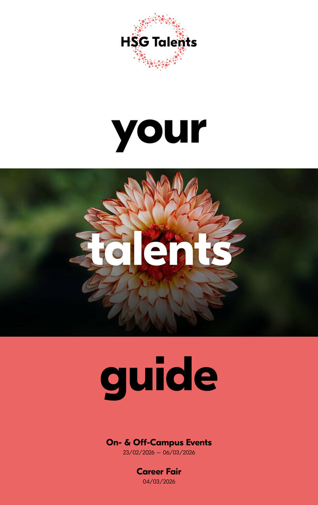 6 Vorwort | Introduction Grow where it matters Neue Perspektiven, neue Möglichkeiten New perspectives, new opportunities Bei der HSG Talents erwarten dich vielfältige At HSG Talents, you will have a variety of oppor- Möglichkeiten, Unternehmen kennenzulernen und tunities to get to know companies and gain an einen authentischen Eindruck von unterschiedli- authentic insight into different career fields. The chen Berufsfeldern zu gewinnen. Die verschiede- diverse event formats offer you different ways nen Eventformate bieten dir unterschiedliche to explore – helping you discover what aligns Zugänge – so kannst du herausfinden, was zu with your interests and goals. deinen Interessen und Zielen passt. With Company Insight, companies present their Mit Company Insight stellen dir Unternehmen work environment directly at the university, provi- ihre Arbeitswelt direkt an der Universität vor und ding insights into tasks, culture, and entry-level geben dir Einblicke in Aufgaben, Kultur und Ein- opportunities. In the interviews, you can show- stiegsmöglichkeiten. In den Interviews kannst du case your motivation and strengths, and discuss deine Motivation und Stärken einbringen und concrete career options with potential employers. dich mit potenziellen Arbeitgebern über konkrete Karriereoptionen austauschen. Workshops, case studies, and creative formats Workshops, Case Studies und kreative Formate or Mix, Shake, Associate give you the chance to wie Recruiting FoodTrail, Confect & Connect oder try new things, gain practical experience, and Mix, Shake, Associate geben dir die Möglichkeit, build valuable connections. The Company Dinner Neues auszuprobieren, praktische Erfahrungen zu also offers a personal setting for inspiring con- such as Recruiting FoodTrail, Confect & Connect, sammeln und wertvolle Kontakte zu knüpfen. Auch versations. das Company Dinner schafft einen persönlichen Rahmen für inspirierende Gespräche. We wish you many exciting experiences, useful insights, and valuable connections during Wir wünschen dir viele spannende Eindrücke, HSG Talents 2026. hilfreiche Erfahrungen und wertvolle Kontakte während der HSG Talents 2026. Adriano Cambria, John Mhuka, Liam Langenskiöld, Karin Peer, Bettina Krone, Alessa Anheuser & Fynn Henn