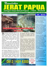 Berdasarkan penelusuran data di inter- net, berbagai kasus lingkungan untuk Papua paling banyak muncul di website suarapapua.com dimana terdapat kolom khusus lingkungan yang sangat membantu siapapun yang membutuhkan data terkait lingkungan di Papua. Muncul 23 berita terkait lingkungan pada empat media yaitu di dua media online lokal Papua yaitu suarapapua.com dan tabloidju- bi.com. Sedangkan untuk media nasional yaitu ANTARA dan tribunnews.com. Masa- lah lingkungan juga muncul di beberapa me- dia nasional tetapi dengan isu yang sama. PT Freeport Indonesia Dari berbagai ka- sus, yang paling menonjol adalah PT Free- port Indonesia. Di awal tahun ini, PT Free- port Indonesia dikabarkan menunjuk mantan Wakil Kepala Badan Intelijen Negara (BIN), Maroef Sjamsoeddin, sebagai presi- Kabarkan Informasi sekitar Anda Melalui SMS S M S W A R G A 9/4/2015, 5 Pustu di wilayah Puskesmas Mapurujaya Timika rusak butuh pem- bangunan yang layak untuk pelayanan kesehatan Dari: +628134450xxxx Keerom, 14/5/2015. Pemerintah Provinsi dan Ka- bupaten serta LSM. Mohon Sosialisasi segala hukum atau aturan kepada masyara- kat kecil, agar kasus Kekera- san Perempuan dan Anak dapat diminimalisir. +628235466xxxx Yahukimo, 29/4/2015. Dekai sudah bagaimana ni ? Mohon bantuan doa dari semua masyarakat Papua untuk penyelesaian konflik di Ya- hukimo. Media massa sudah informasikan pelanggaran HAM di Dekai dan seki- tarnya, kami semua panik, apalagi kami perempuan dan anak-anak. (+628524453xxxx) Timika:20-22/4/15 kegiatan review kembali Rencana Aksi Daerah perlindungan bagi korban kekerasan terpadu perempuan dan anak di ruang pertemuan kantor Bappeda Nomor: +628219968xxxx Selengkapnya : www.sms.jeratpapua.org den direktur yang baru mengganti- kan Rozik B. Soetjipto yang akan memasuki masa pensiun dalam wak- tu dekat. Selain pergantian presiden direktur tersebut, persoalan pembangunan smelter PT. Freeport Indonesia men- jadi soroton banyak media, baik di Papua dan di tingkat nasional. Pemerintah Indonesia yang awalnya merencanakan pembangunan smelter ini di Gresik, Jawa Timur mendapat perlawanan dari Pemerintah Daerah Provinsi dalam hal ini Gubernur, Lu- kas Enembe. Berbagai upaya dilakukan Lukas En- embe agar smelter PT Freeport Indo- nesia dibangun di Papua. Lukas En- embe mengajak serta bupati-bupati